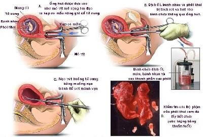 Phương pháp hút chân không: Áp dụng cho thai từ 8- 12 tuần tuổi bằng kỹ thuật bơm hút chân bằng ống siêu dẫn trực quan kết hợp với màn hình kỹ thuật số, soi buồng tử cung định vị chính xác túi thai đưa thai ra ngoài mà không làm tổn thương tử cung.